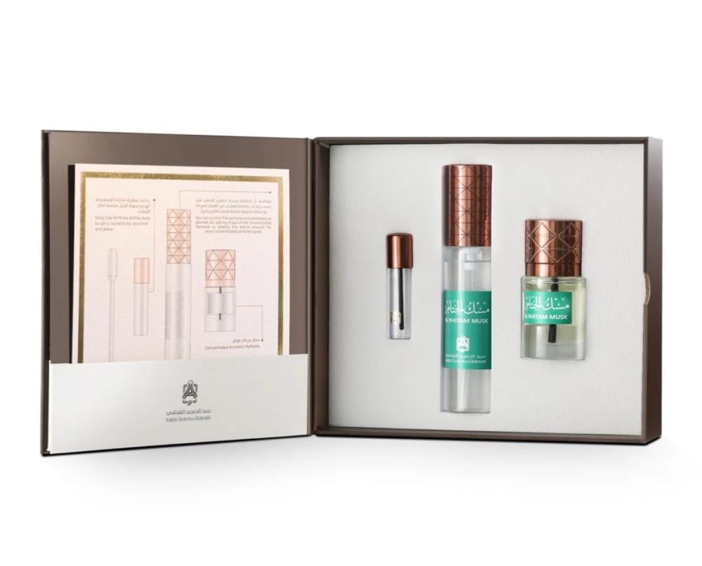 Al Khitam Musk Mini Set by Abdul Samad Al Qurashi delivers the same iconic clean musk scent in a practical and elegant format.